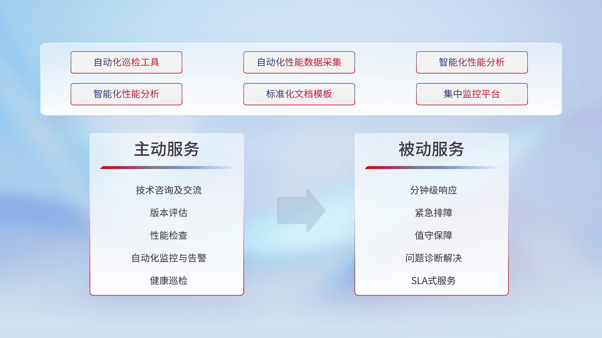 智能化工具和标准化文档,,保障服务质量,,,,提供主动服务(包含技术咨询、、、版本评估、、、性能检查、、、自动化监控与告警、、、健康巡检)和被动服务包含(分钟级响应、、紧急排障、、、、值守保障、、、、问题诊断解决、、SLA服务)。。。